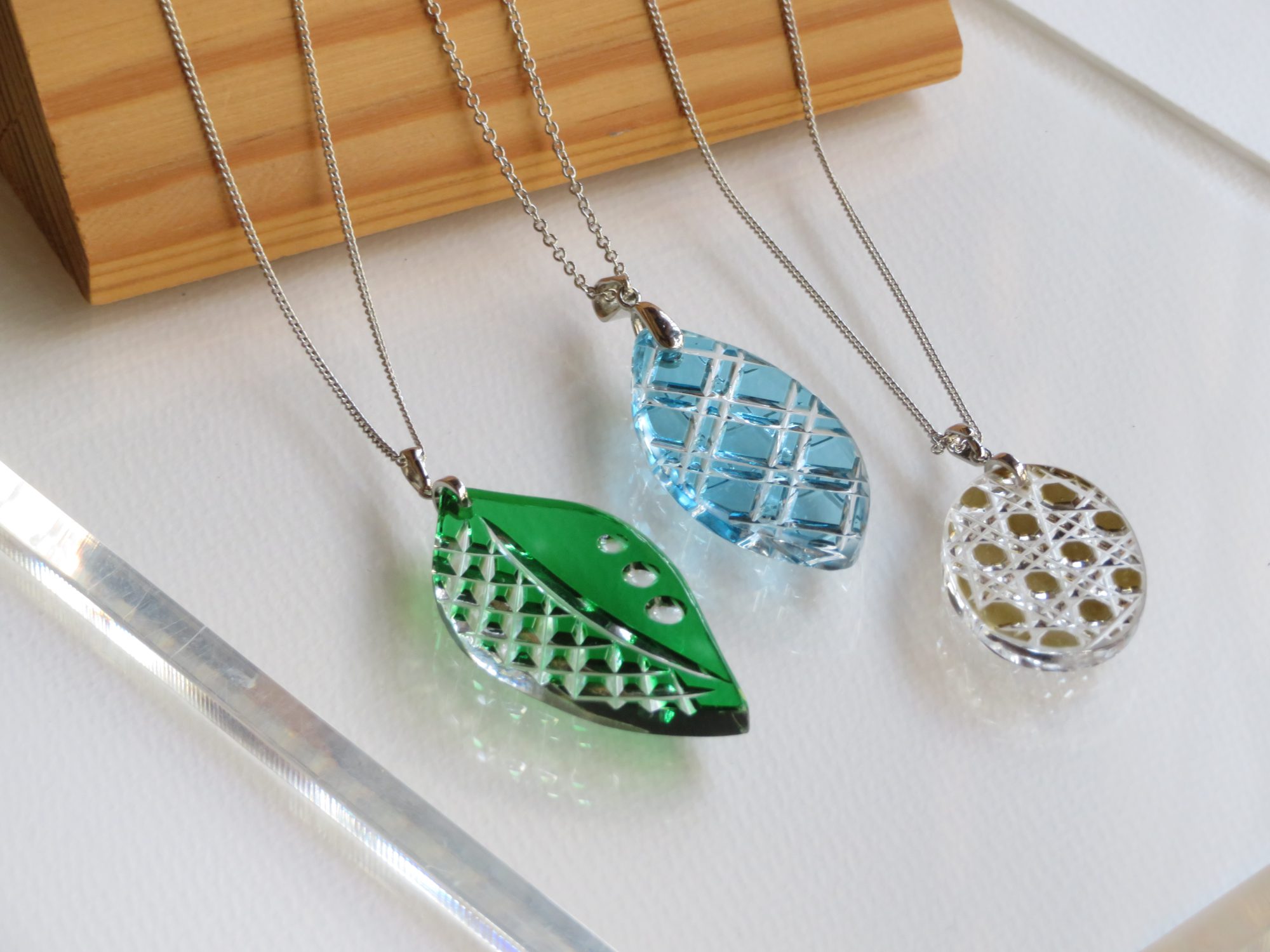 石川貴子さん作ペンダント 手前から「リーフ」「リバーシブル」「かごめ」