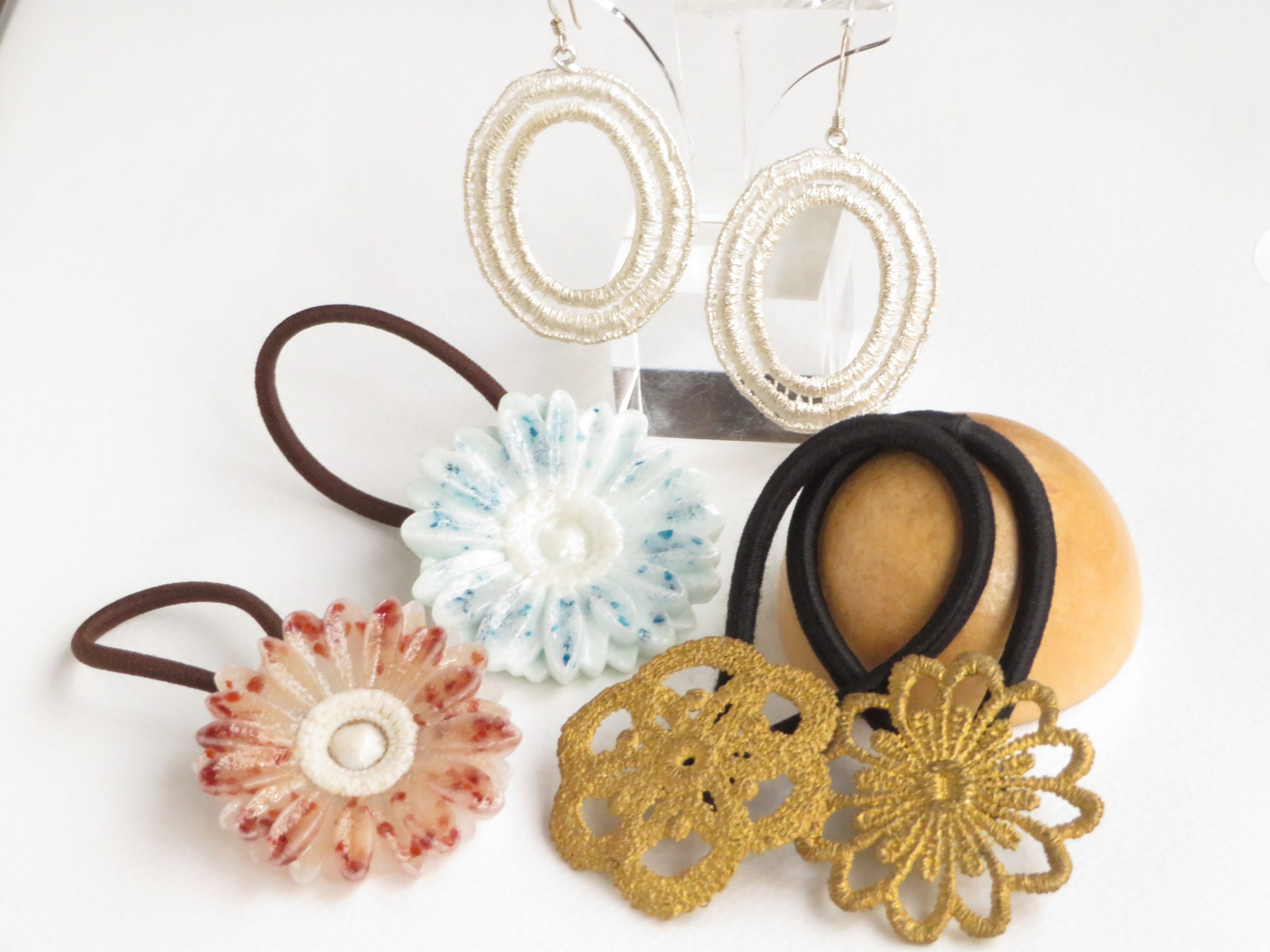 髙橋あずささん作 「レースヘアゴム」「レース丸ピアス」