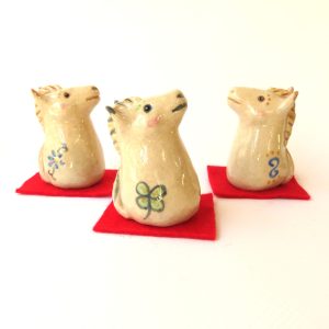 萩焼きでできた、午の置物は1つ1つの絵柄の可愛いらしさが特徴です。手のひらにのるサイズなので玄関、リビング、机の上などいろいろなところに飾れます。