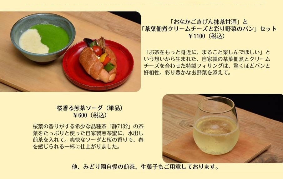 郷町〇店ー〈お茶のみどり園〉「抹茶甘酒」と「茶葉佃煮クリームチーズと彩り野菜のパン」セットなど