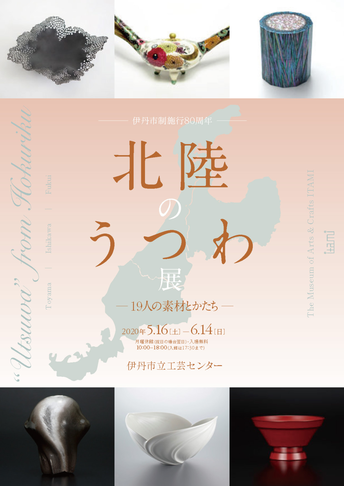 日本全国の様々な地域にスポットをあて、その地ゆかりの工芸作家による“うつわ”を紹介してきた展覧会。今回は、北陸地方の富山、石川、福井の3県を取り上げます。北陸地方は、工芸の盛んな地域として知られ、また近年、歴史の中で培われた技術や手法を踏まえながらも現代感覚を取り入れ、独自の表現を追求する工芸作家が増えつつあります。また各種工芸教育・研修機関も多く、国内外で活躍する工芸作家が多数輩出されており、日本の工芸の拠点の一つとして、今後益々の国際的な注目が期待される地域です。本展では、この地に制作の基盤を置く陶、漆、金工、ガラスの4分野の作家19名の作品が一堂に会します。それぞれのつくり手たちの個性が映し出された多彩な“うつわ”による継承と革新の競演をご覧ください。