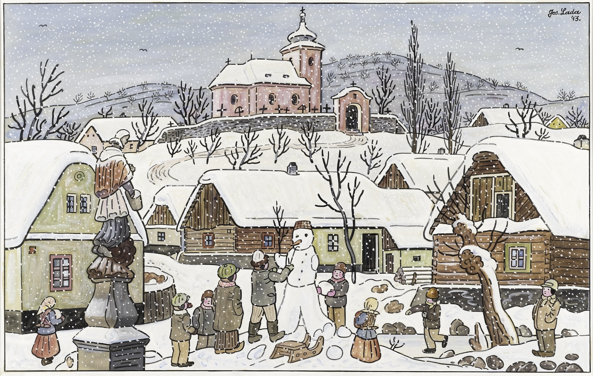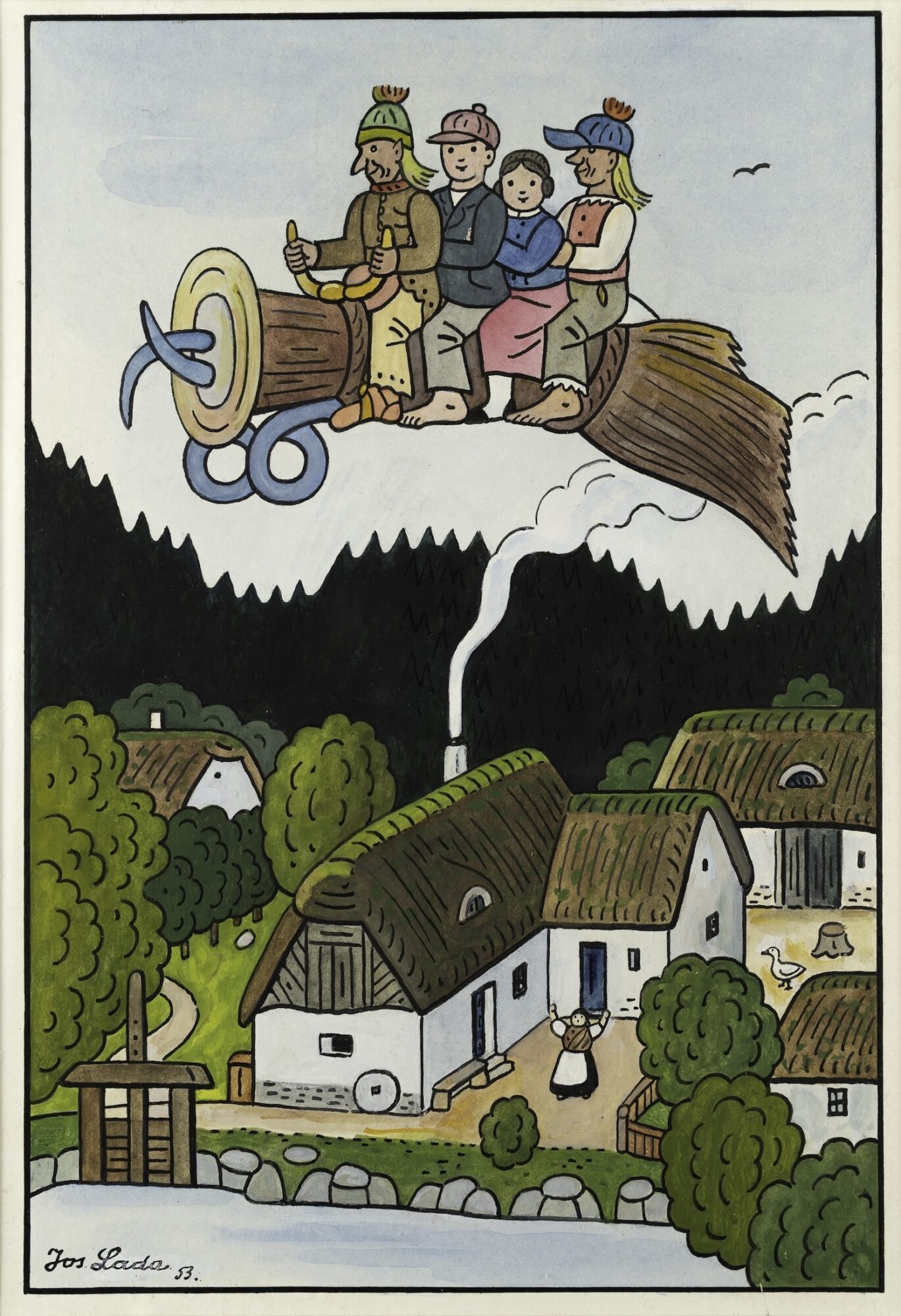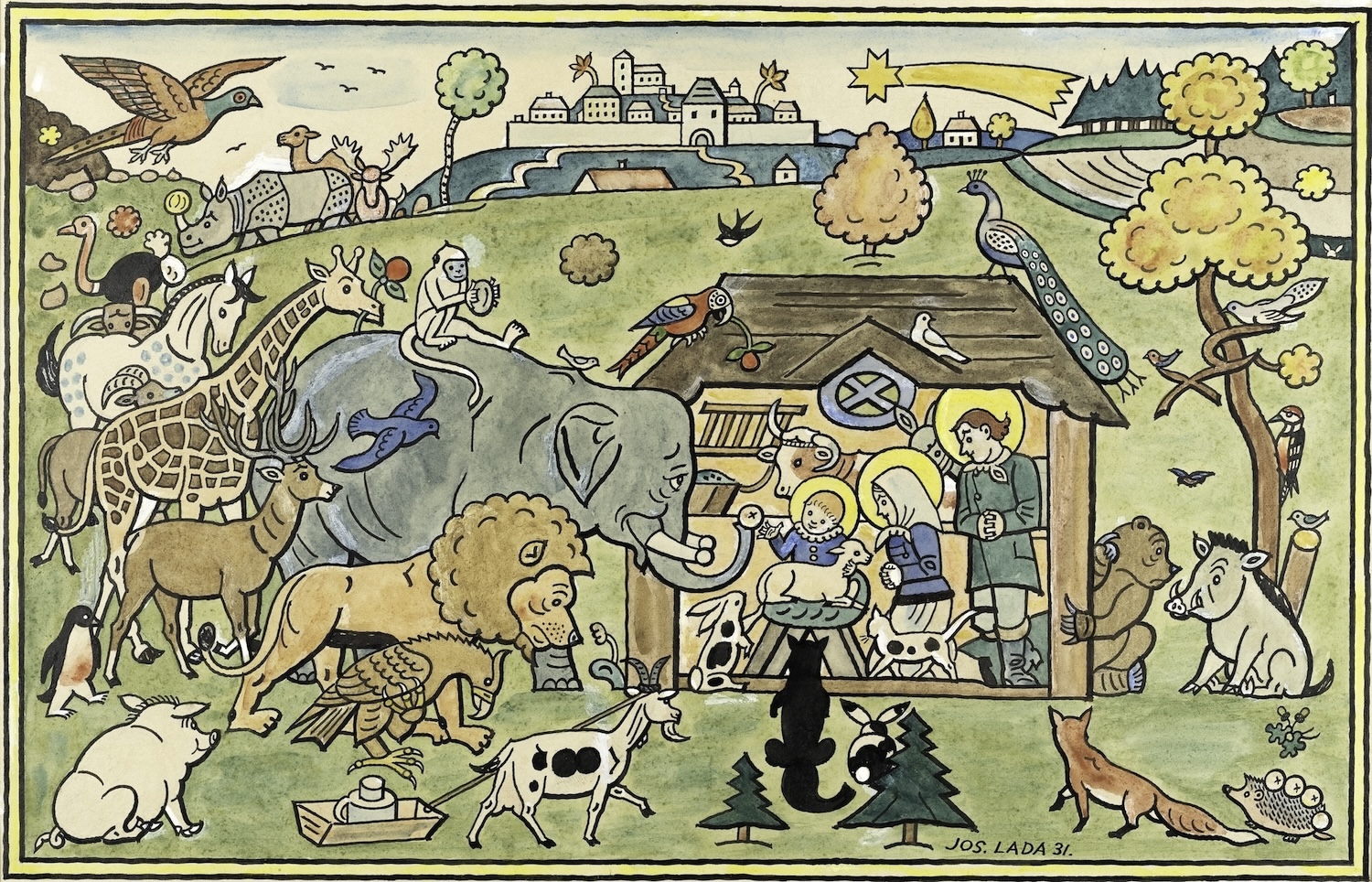 プラハ南東の小さな村フルシツェにて貧しい靴屋の息子として生まれたラダは、幼い頃に右眼を失明しながらも絵をほぼ独学で学び、明瞭な線描と色彩による画風を確立します。やがて新聞雑誌の諷刺画を描くようになり、ヤロスラフ・ハシェクの小説『兵士シュヴェイクの冒険』の挿絵を手がけたことで一躍有名になります。また、我が子のために創作童話をつくったことをきっかけに子どもの本にも取り組み、後年には絵画も制作しました。幼い頃に過ごした農村での思い出をもとに、季節がめぐる自然のなかで暮らす人びとや動物たちの姿を素朴に描いた作品は、チェコをはじめ世界中の人たちを魅了しています。