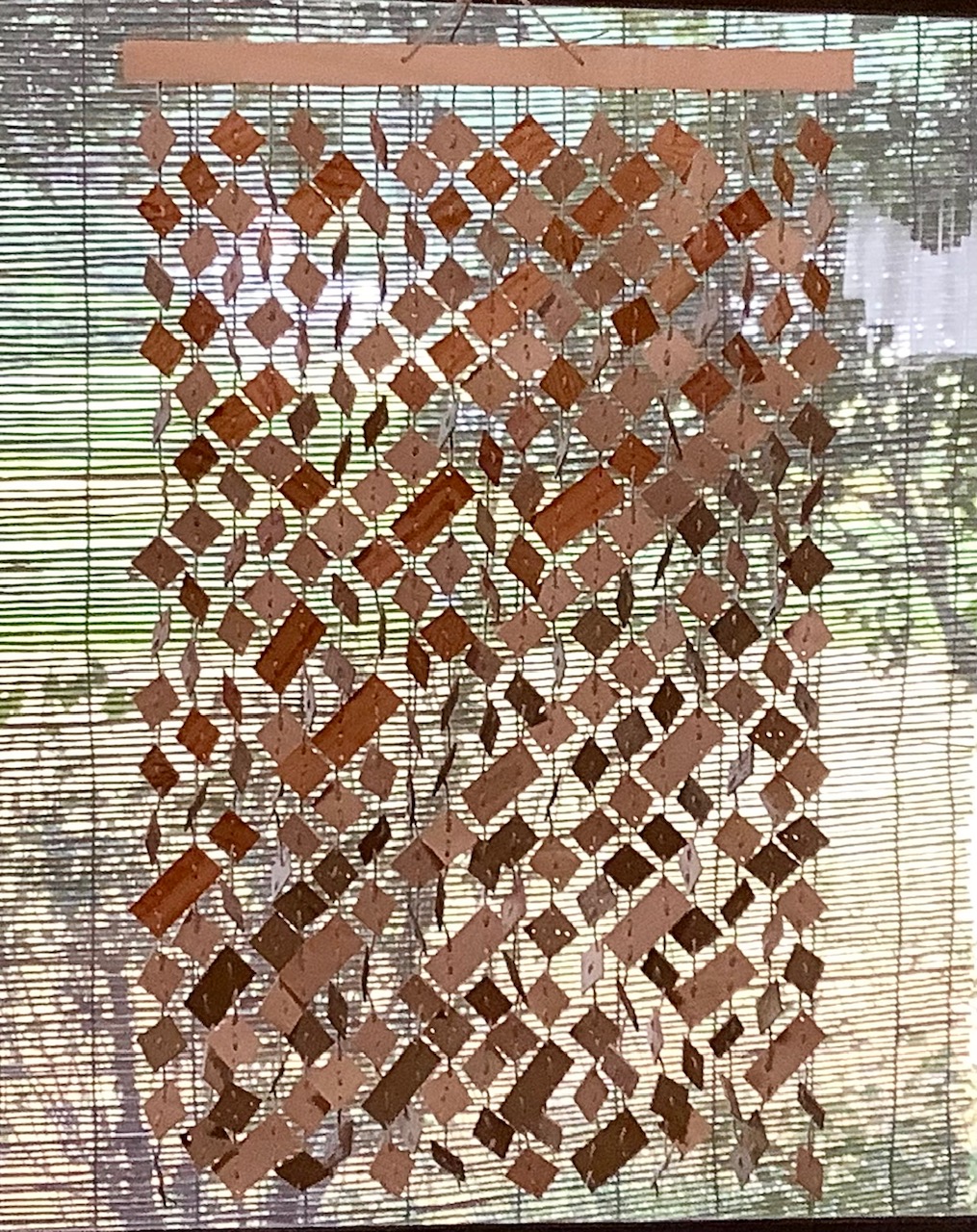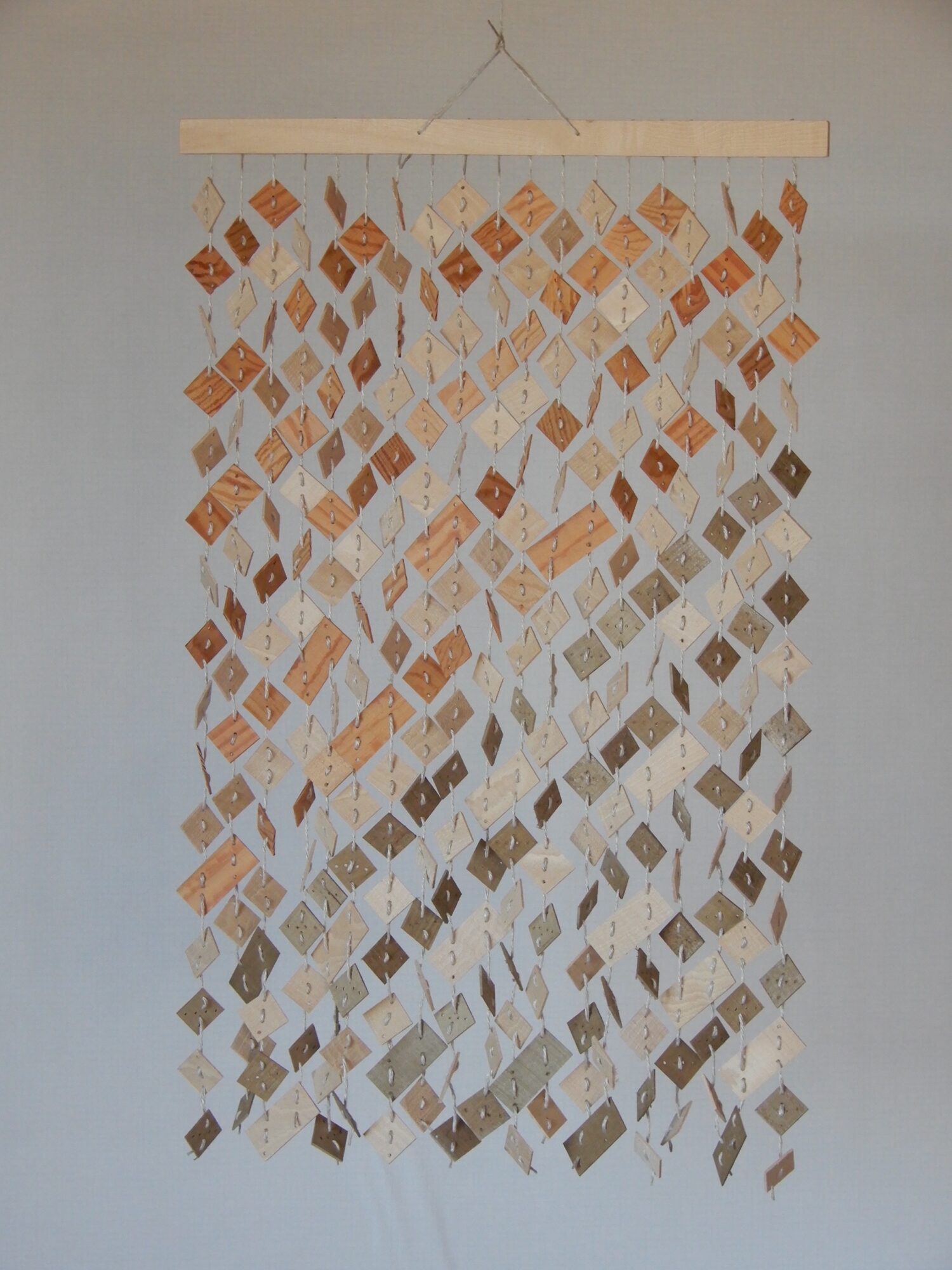 木片(18㎜角、2㎜厚)を麻糸でつなぎ合わせてつくるモビールです。